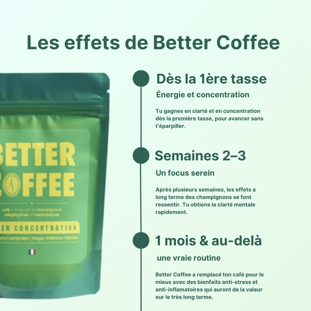 Place à une productivité stable, un focus inébranlable et des résultats concrets. Que tu sois entrepreneur, créatif, développeur ou simplement quelqu'un qui veut performer au quotidien, Better Coffee est le café qu'il te manquait pour passer au niveau supérieur.